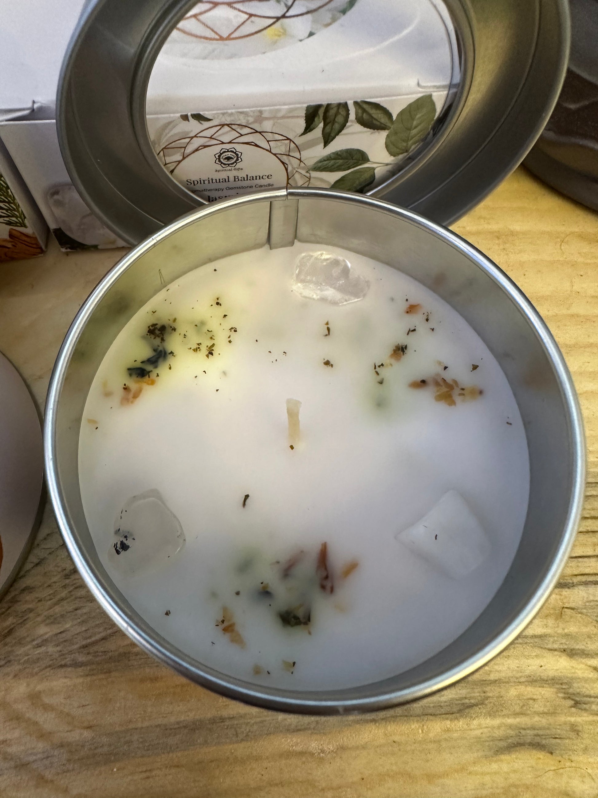 Candela con cera di soia “Spiritual Balance” Gelsomino e Cristalli di Rocca